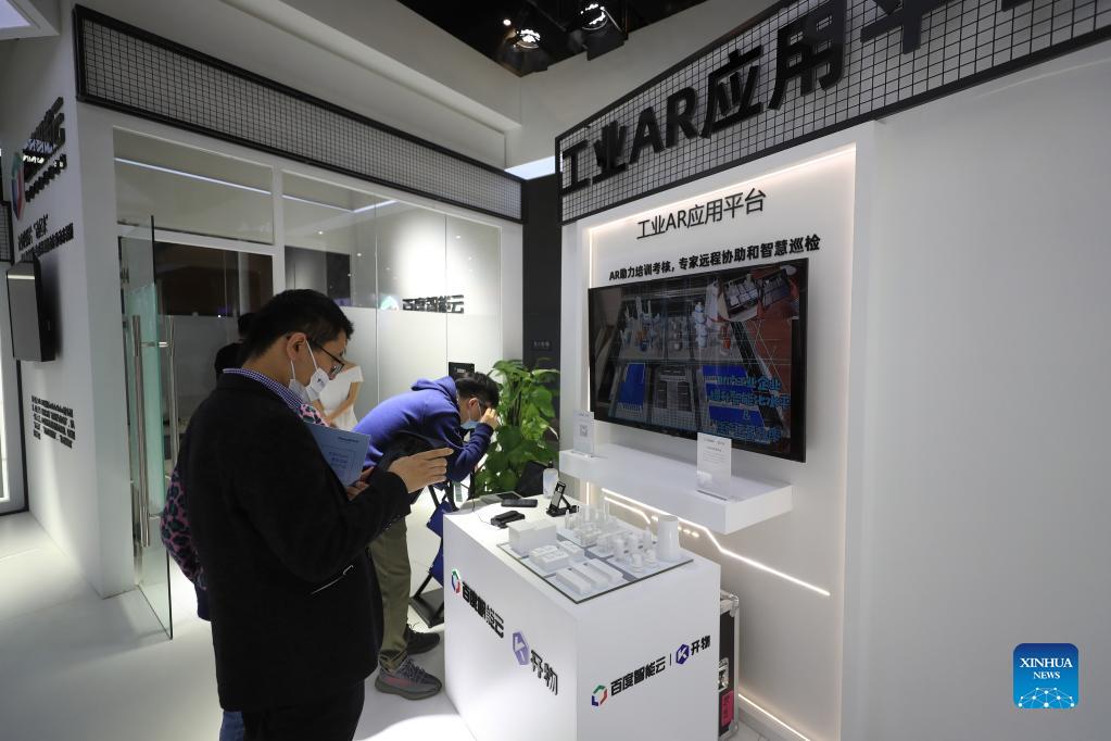 Participants experience an industrial AR application platform of Baidu Cloud at an auxiliary exhibition during the 2021 Global Industrial Internet Conference in Shenyang, capital of northeast China's Liaoning Province, Oct. 18, 2021. The 2021 Global Industrial Internet Conference kicked off here on Monday. (Xinhua/Yang Qing)