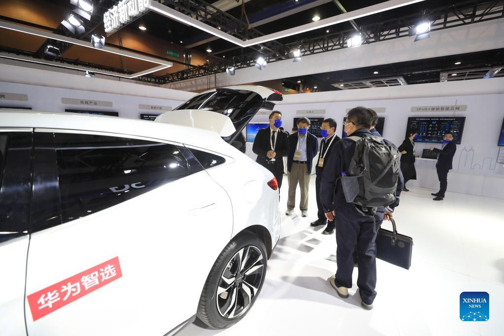 Participants learn about an electric car displayed at the booth of Huawei Technologies Co., Ltd. at an auxiliary exhibition during the 2021 Global Industrial Internet Conference in Shenyang, capital of northeast China's Liaoning Province, Oct. 18, 2021. The 2021 Global Industrial Internet Conference kicked off here on Monday. (Xinhua/Yang Qing)
