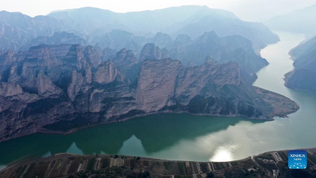 Aerial photo taken on Oct. 18, 2021 shows the scenery at Bingling Danxia National Geological Park in Yongjing County, northwest China's Gansu Province. (Photo by Shi Youdong/Xinhua)