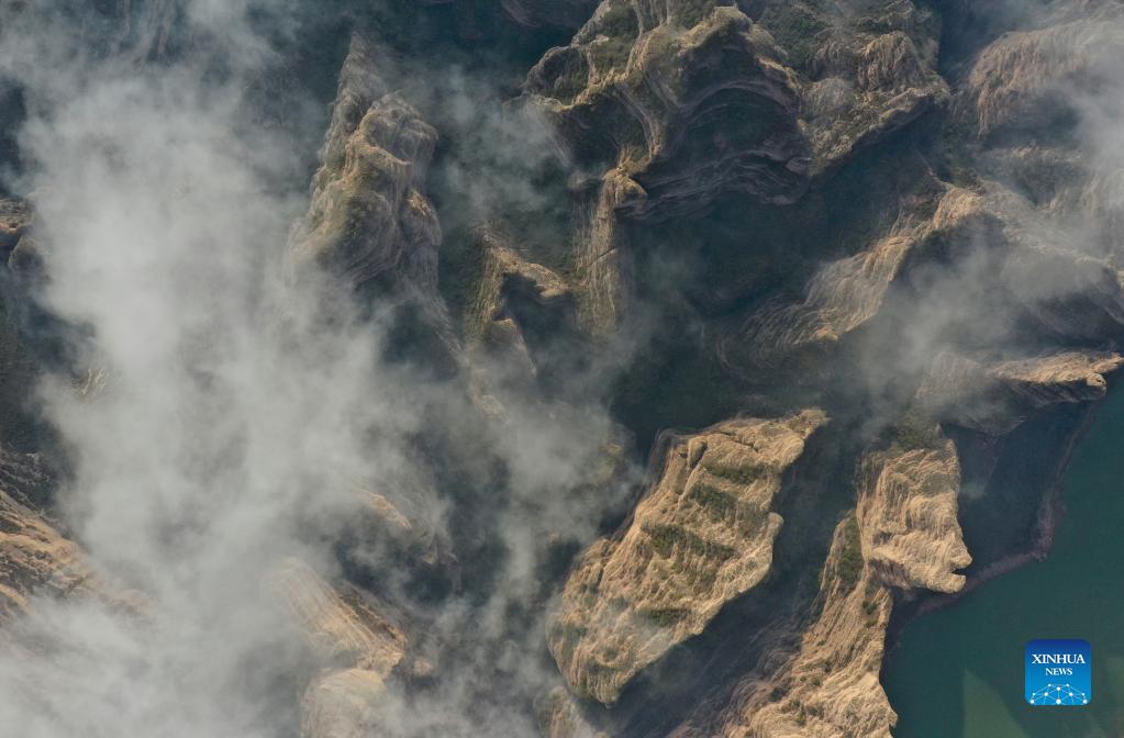 Aerial photo taken on Oct. 18, 2021 shows the scenery at Bingling Danxia National Geological Park in Yongjing County, northwest China's Gansu Province. (Photo by Shi Youdong/Xinhua)