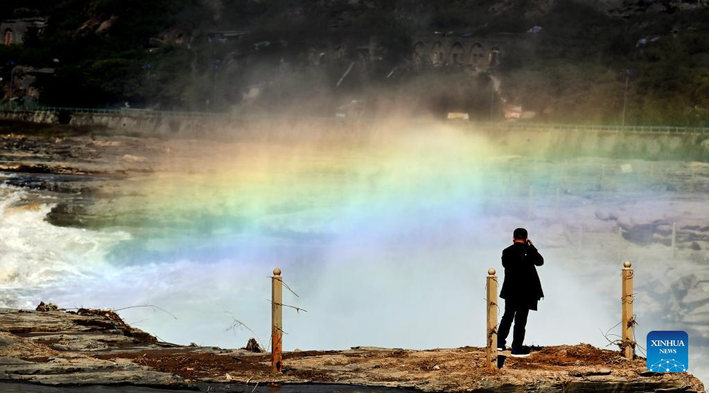Photo taken on Oct. 18, 2021 shows a rainbow over the Yellow River's Hukou Waterfall in northwest China's Shaanxi Province. (Xinhua/Tao Ming)