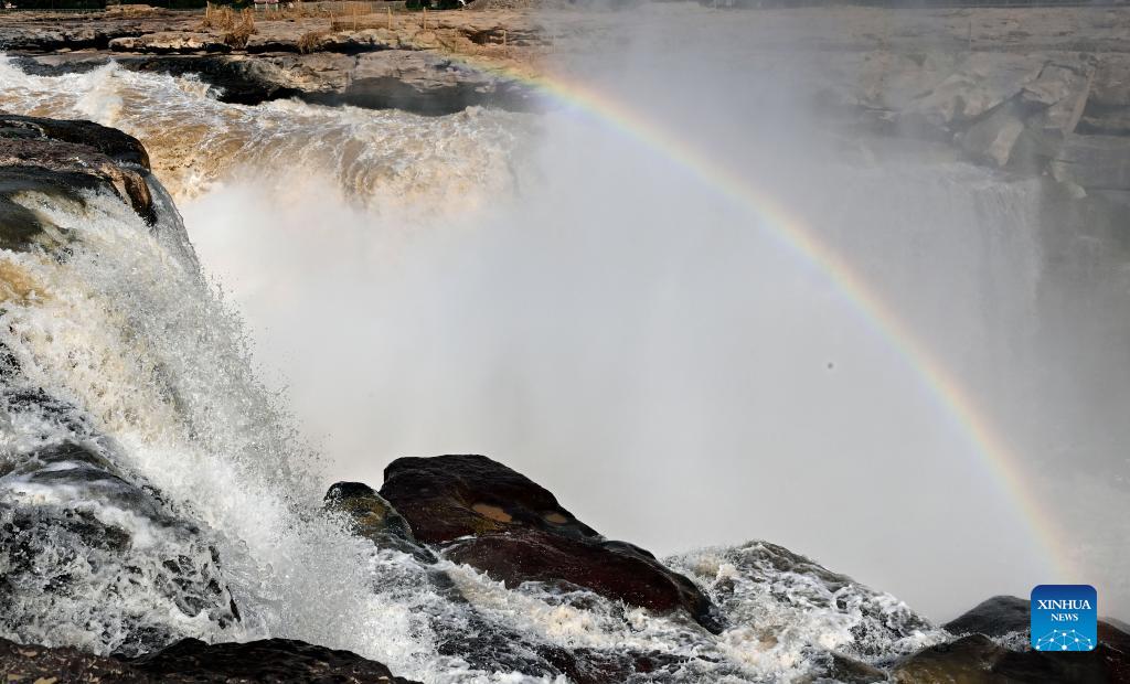 Photo taken on Oct. 18, 2021 shows a rainbow over the Yellow River's Hukou Waterfall in northwest China's Shaanxi Province. (Xinhua/Tao Ming)