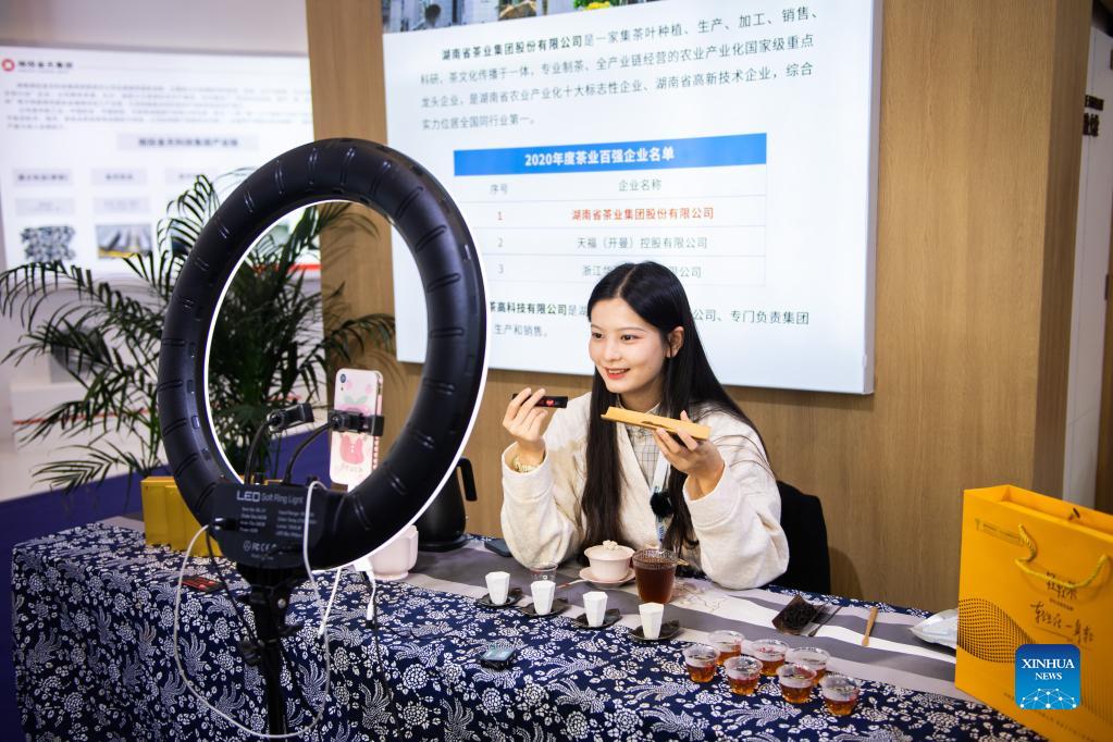 A staff member sells tea products via livestreaming during the Global Economic Development and Security Forum Expo of the Boao Forum for Asia (BFA) in Changsha, central China's Hunan Province, Oct. 18, 2021. With the theme of economic security and sustainable development in a world of great change, the three-day forum aims to provide a high-end platform for promoting dialogue between political and business leaders from around the world. (Xinhua/Chen Sihan)