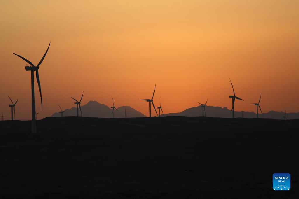 Windmills are silhouetted against the sunset in Hurghada, Egypt, on Oct. 18, 2021. (Xinhua/Ahmed Gomaa)