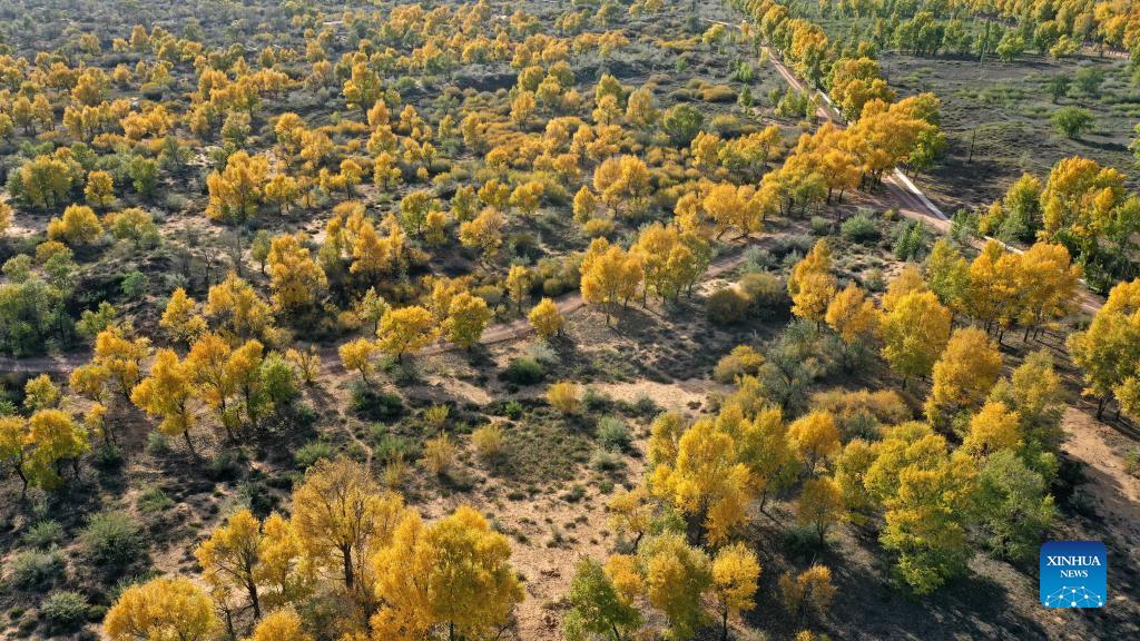 Aerial photo taken on Oct. 15, 2021 shows the autumn scenery at Haba Lake nature reserve of Yanchi County, northwest China's Ningxia Hui Autonomous Region. (Xinhua/Wang Peng)