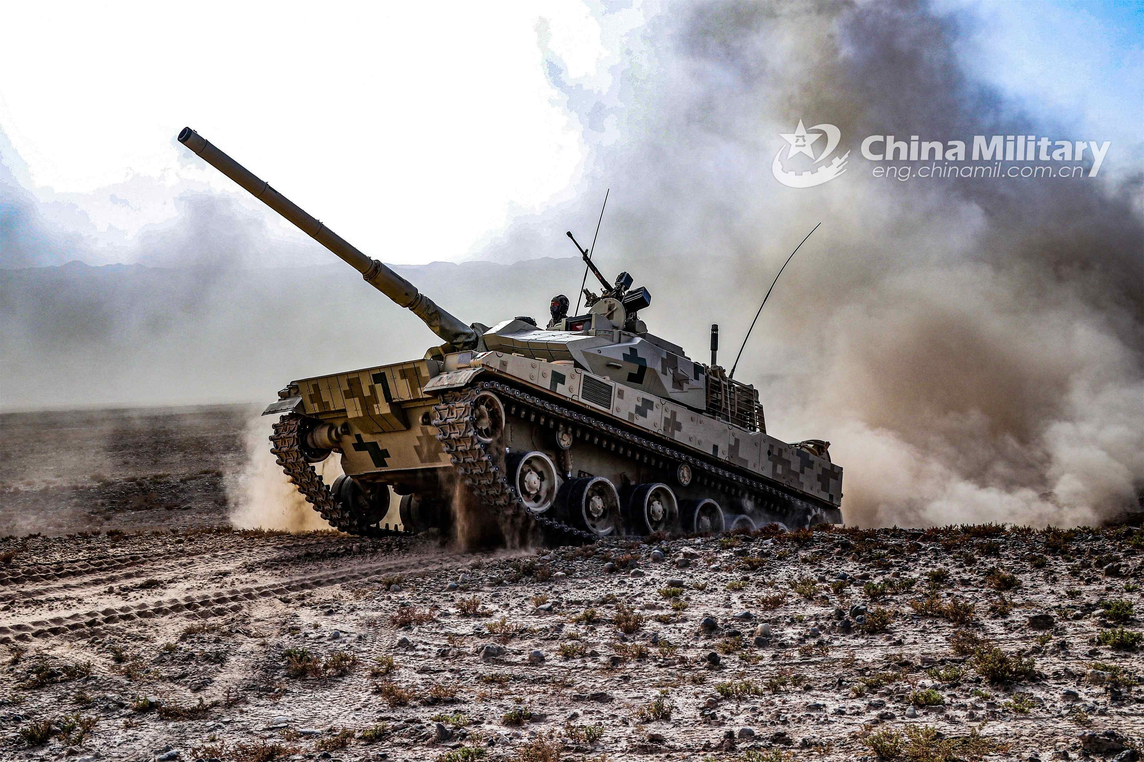 A main battle tank (MBT) attached to a combined-arms regiment under the PLA Xinjiang Military Command rumbles through mound of dust as it crosses trench obstacles in complex terrain during a driving skill training exercise on September 27, 2021. (eng.chinamil.com.cn/Photo by Chen Ming)