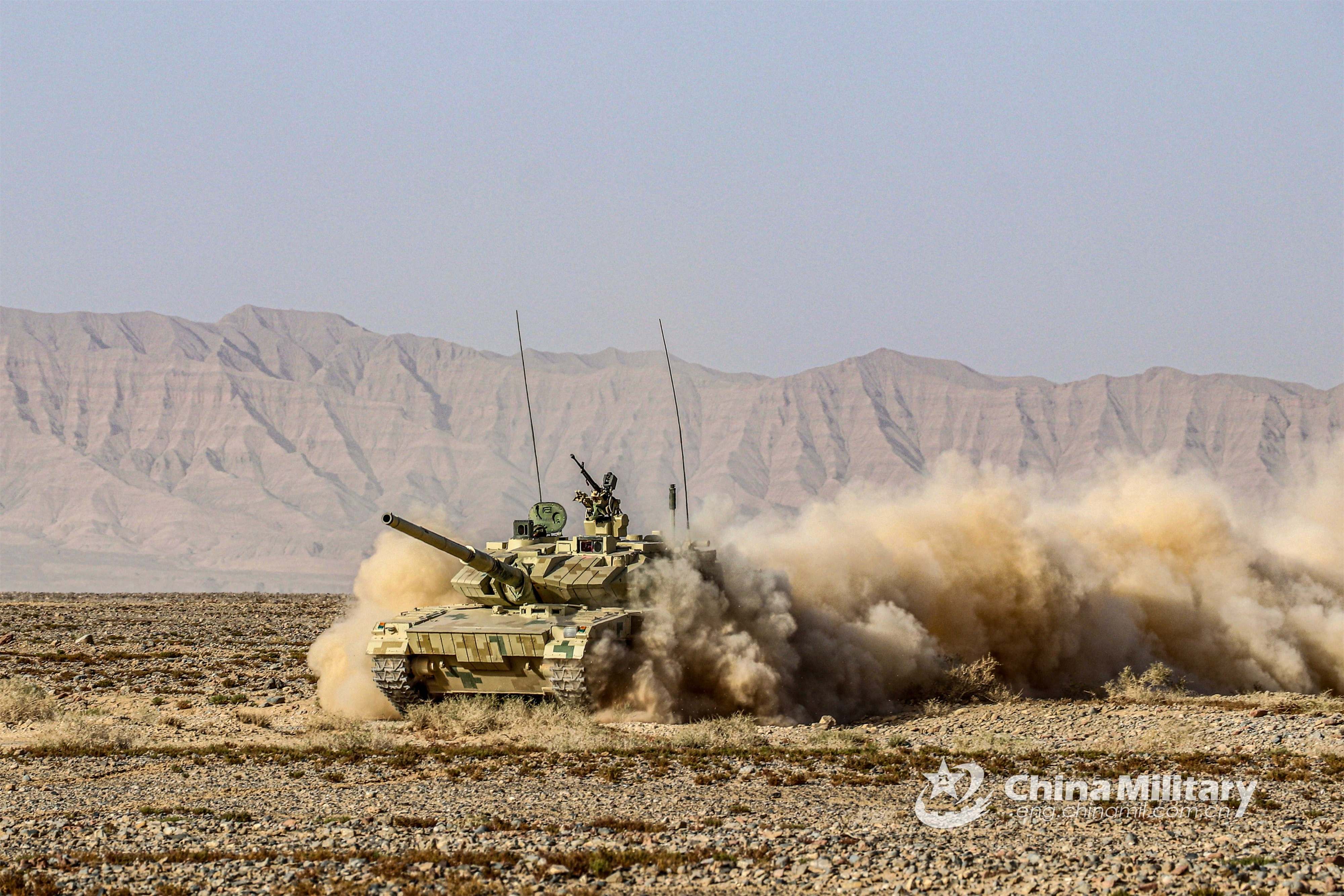 A main battle tank (MBT) attached to a combined-arms regiment under the PLA Xinjiang Military Command rumbles through mound of dust as it crosses trench obstacles in complex terrain during a driving skill training exercise on September 27, 2021. (eng.chinamil.com.cn/Photo by Chen Ming)