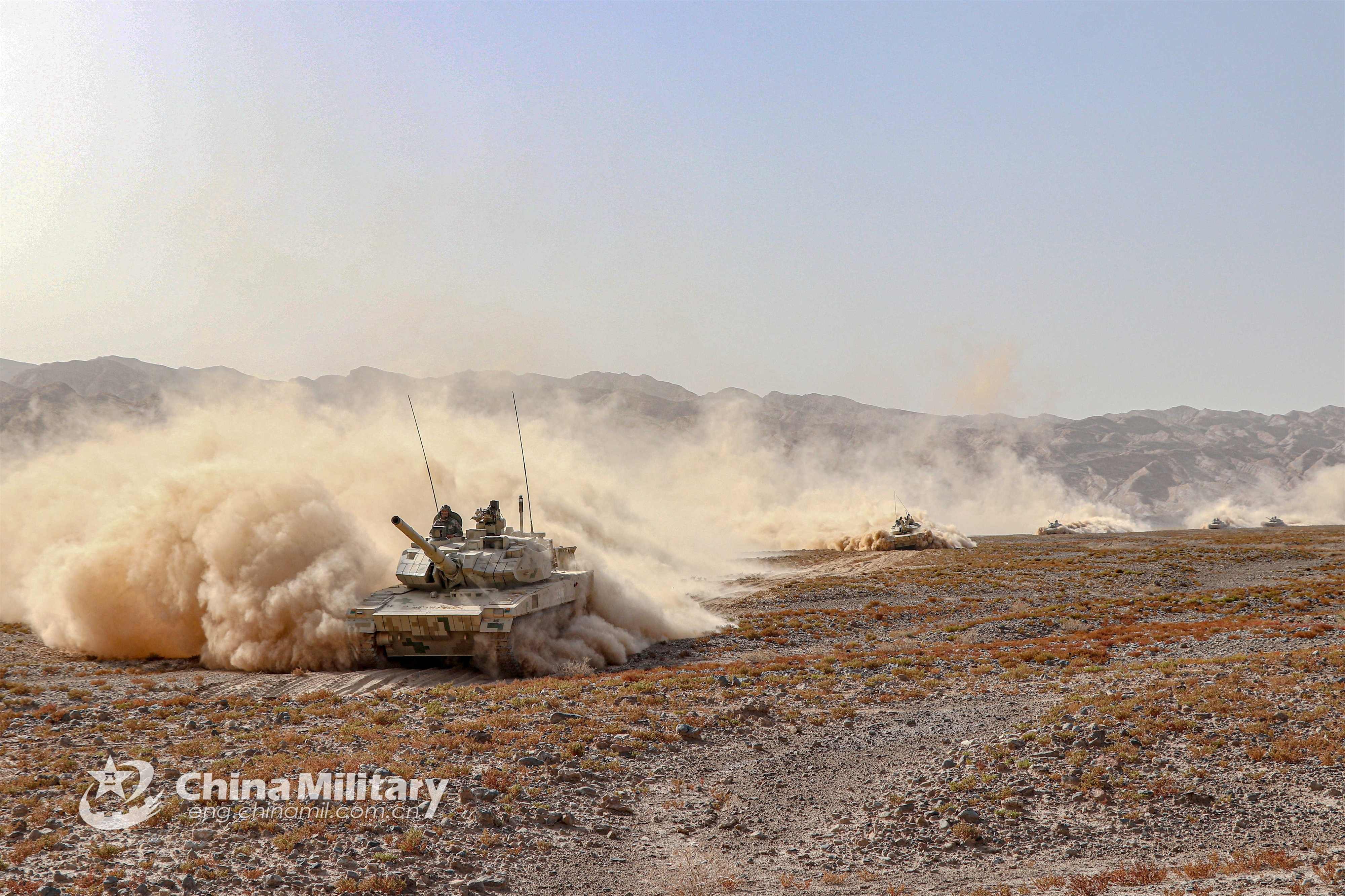 Main battle tanks (MBTs) attached to a combined-arms regiment under the PLA Xinjiang Military Command rumble in formation towards the designated training field on September 27, 2021. (eng.chinamil.com.cn/Photo by Chen Ming)