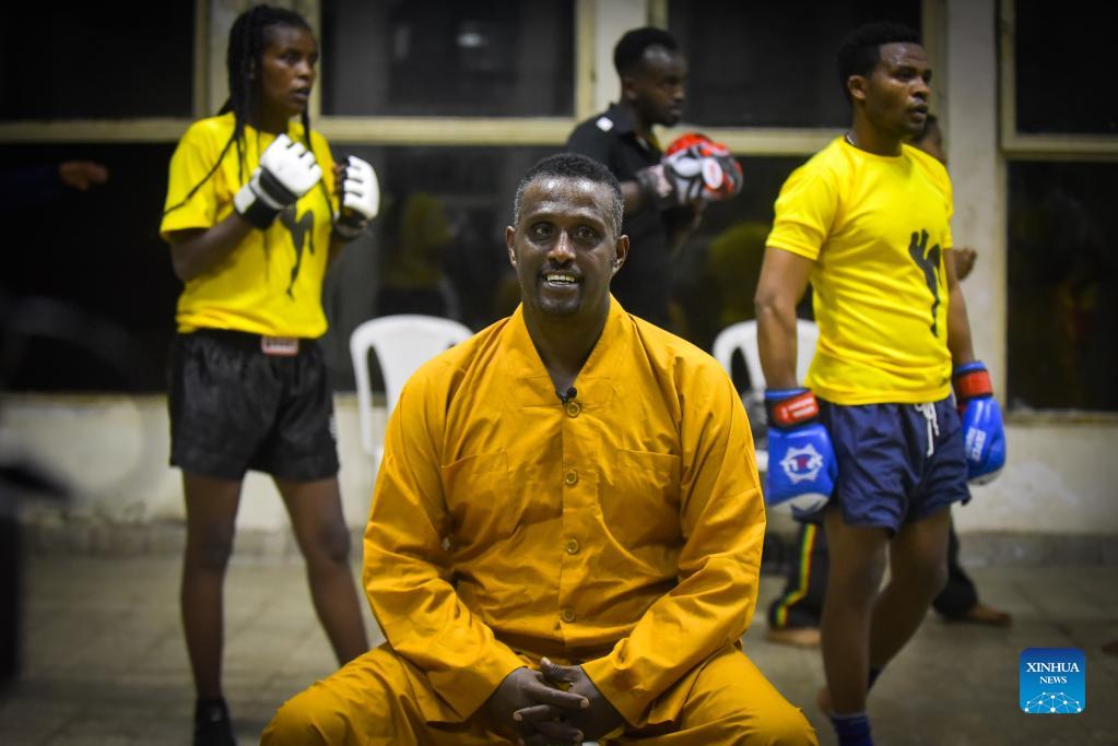 Photo taken on Sept. 29, 2021 shows master Dawit Terefe (front) who works as a coach at Dave Dan Wushu and Kickboxing Training Center in Addis Ababa, Ethiopia. (Xinhua/Michael Tewelde)