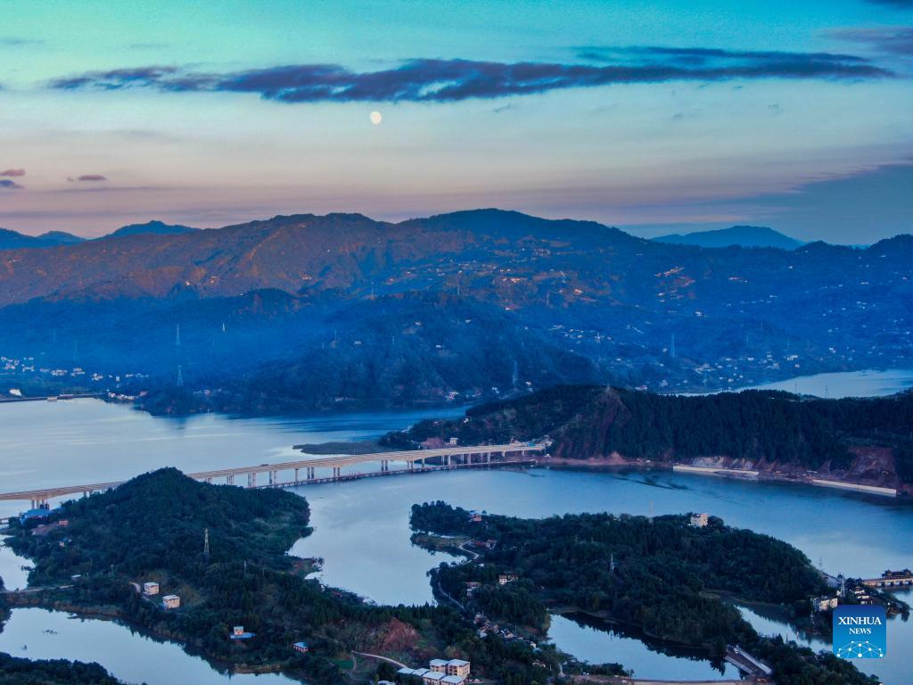Aerial photo taken on Oct. 18, 2021 shows the sunset scenery of Hanfeng Lake in Kaizhou District of Chongqing, southwest China. (Xinhua/Liu Chan)