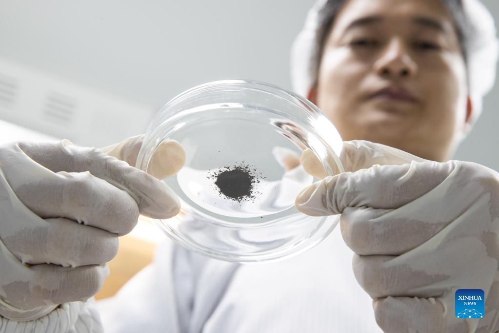 Tian Hengci, an associate research fellow, deals with lunar samples at the Institute of Geology and Geophysics of the Chinese Academy of Sciences in Beijing, capital of China, Oct. 15, 2021. Chinese researchers have studied the lunar samples brought back by the Chang'e-5 mission and dated the youngest rock on the Moon at around 2 billion years in age, extending the "life" of lunar volcanism 800-900 million years longer than previously known. The study, conducted mainly by a research team at the Institute of Geology and Geophysics (IGG), Chinese Academy of Sciences (CAS), was presented in three Nature papers and published online Tuesday. (Xinhua/Jin Liwang)