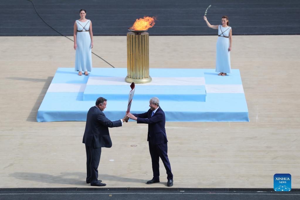 At the marble venue of the first modern Olympics in 1896, Hellenic Olympic Committee President and International Olympic Committee (IOC) member Spyros Capralos passed the sacred flame to Yu Zaiqing, special representative and vice president of the Beijing 2022 Organizing Committee.