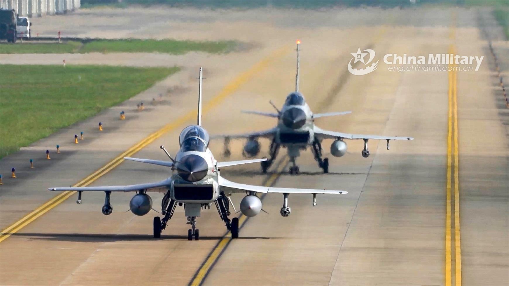 Two fighter jets attached to a naval aviation brigade under the PLA Eastern Theater Command taxi in close formation on the runway to get ready for a live-fire training exercise on September 15, 2021. (eng.chinamil.com.cn/Photo by Zhao Ningning)