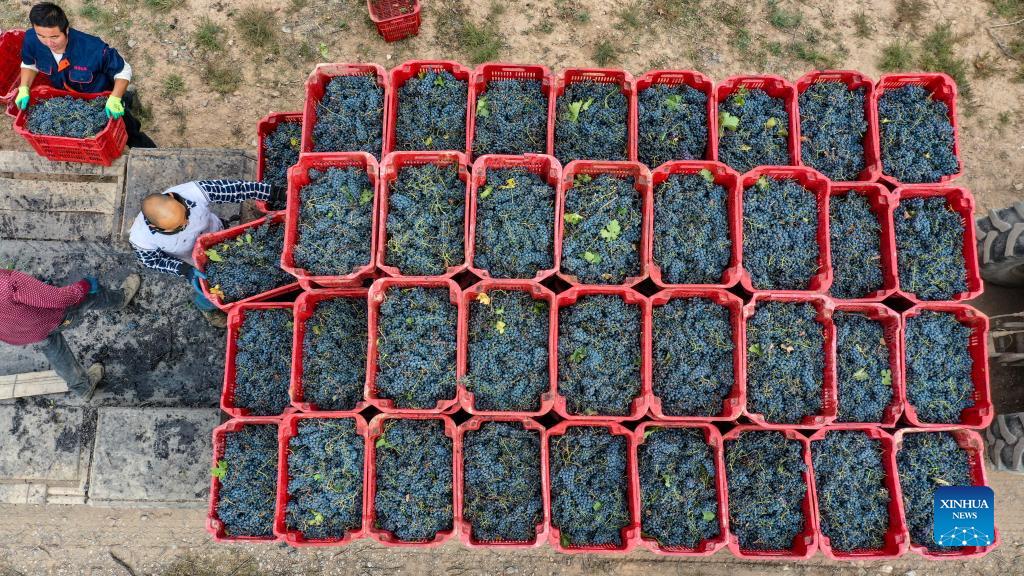 Aerial photo taken on Oct. 14, 2021 shows workers conveying grapes in a vineyard at the eastern foot of Helan Mountain, northwest China's Ningxia Hui Autonomous Region. Farmers here are busy picking up wine grapes during the harvest season in the vineyards. With abundant sunshine, rich irrigation and an appropriate climate, Ningxia's vast barren Gobi Desert is deemed the "golden zone" for growing wine grapes. (Xinhua/Wang Peng)