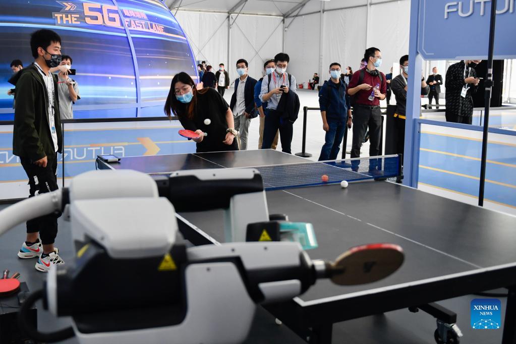 People plays table tennis with a serving robot during the 2021 Apsara Conference in Hangzhou, east China's Zhejiang Province, Oct. 19, 2021. The four-day conference kicked off in Hangzhou on Tuesday. The Apsara Conference, formerly known as Ali cloud developers' conference, is the earliest platform showcasing innovations in China. (Xinhua/Huang Zongzhi)