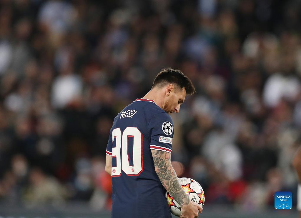 Lionel Messi of Paris Saint-Germain reacts during the Champions League Group A soccer match between Paris Saint-Germain and RB Leipzig at the Parc des Princes in Paris, France, Oct. 19, 2021. (Xinhua/Gao Jing)