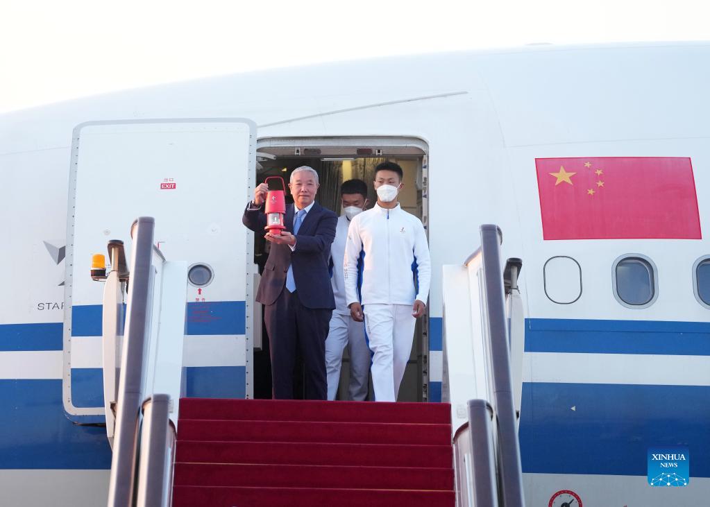 Special Representative and Vice-President of Beijing 2022 Yu Zaiqing carries the flame lantern as the Beijing 2022 Olympic flame arrived at Capital International Airport in Beijing, capital of China, Oct. 20, 2021. The Olympic flame, ignited for the Beijing 2022 Olympic Winter Games in Ancient Olympia in western Greece, arrived in Beijing Wednesday morning. A welcoming ceremony was held at the Olympic Tower, an iconic landmark from the 2008 Beijing Olympic Games. (Xinhua/Zhang Chenlin)