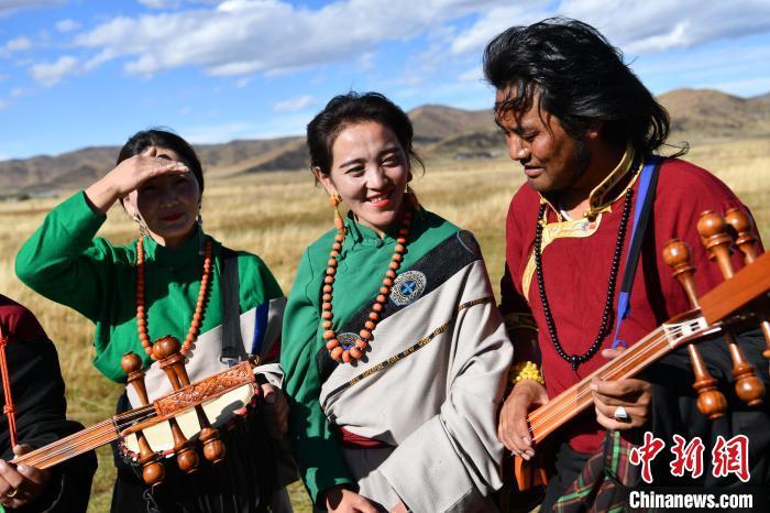 Several artists sing Tibetan songs accompanied by Longtouqin, or dragon-head harp, on Hongyuan Prairie of Aba Tibetan and Qiang Autonomous Prefecture, Sichuan Province, Oct. 19, 2021. (Photo: China News Service/Zhang Lang)