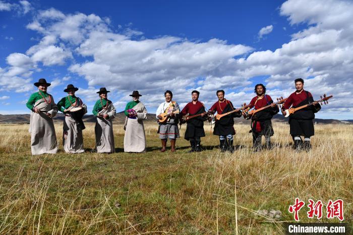 Several artists sing Tibetan songs accompanied by Longtouqin, or dragon-head harp, on Hongyuan Prairie of Aba Tibetan and Qiang Autonomous Prefecture, Sichuan Province, Oct. 19, 2021. (Photo: China News Service/Zhang Lang)