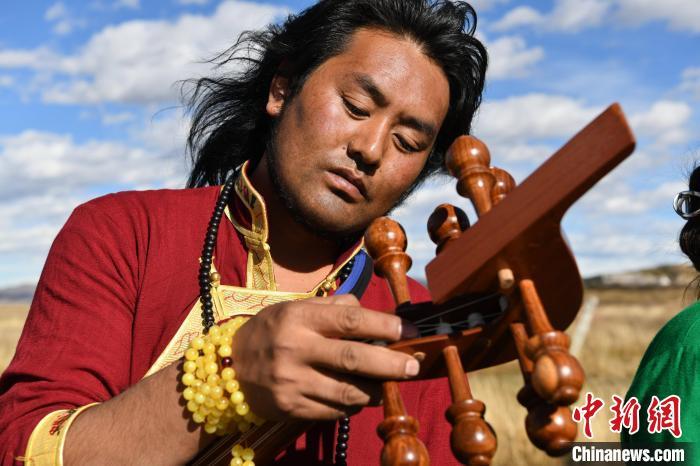 Several artists sing Tibetan songs accompanied by Longtouqin, or dragon-head harp, on Hongyuan Prairie of Aba Tibetan and Qiang Autonomous Prefecture, Sichuan Province, Oct. 19, 2021. (Photo: China News Service/Zhang Lang)