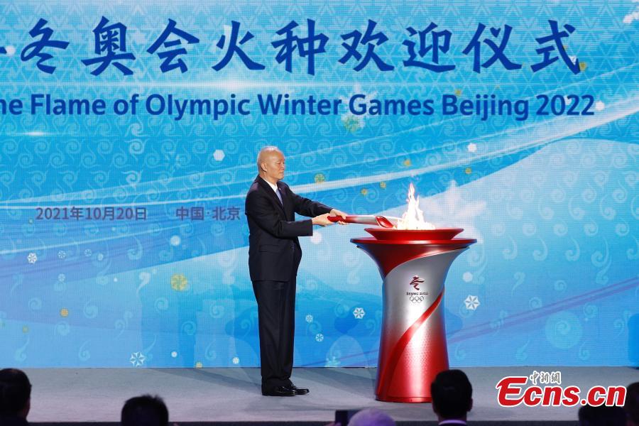 Cai Qi, chairman of the Organizing Committee of the Olympic Winter Games Beijing 2022, lights the torch at the welcome ceremony in Beijing, Oct. 20, 2021. (Photo: China News Service/Han Haidan)
