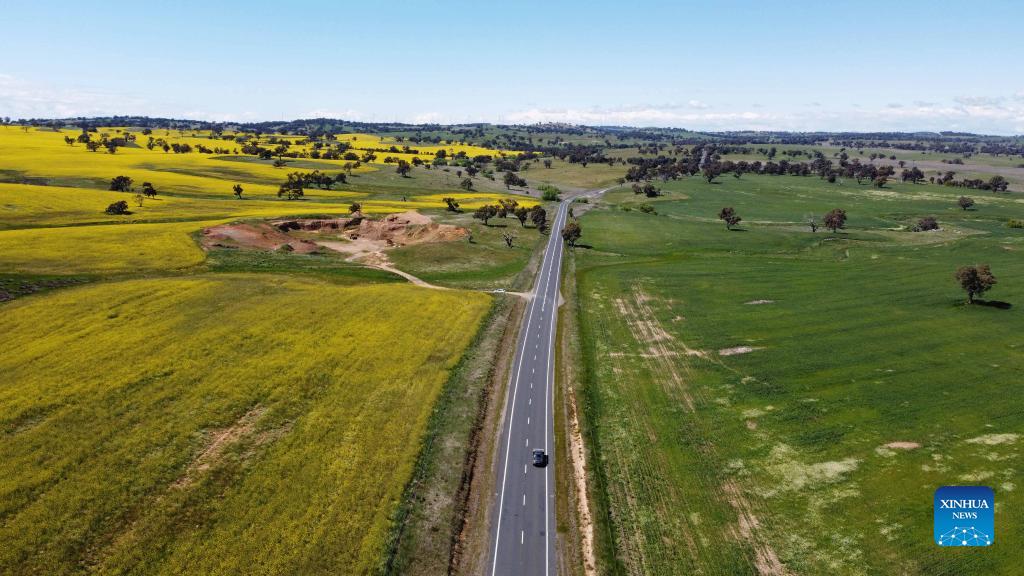 Aerial photo taken on Oct. 19, 2021 shows a view of a canola field outside Canberra, capital of Australia. (Photo by Jiang Chenyi/Xinhua)