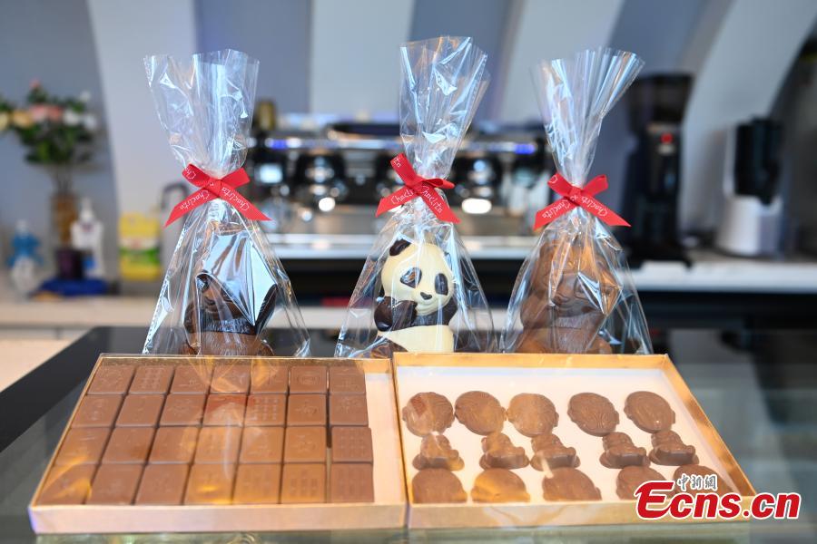 Photo taken on Oct. 19, 2021 shows the chocolate in the shapes of giant panda, Sichuan Opera masks and Mahjong in a cafe in Chengdu, Sichuan Province. (Photo: China News Service/An Yuan)