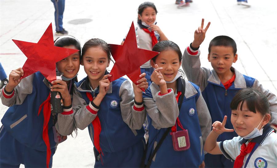 Students of a primary school in Yining city, Ili Kazak autonomous prefecture in Xinjiang, pose for photos on Sept 28, 2021. (Photo: chinadaily.com.cn/Zou Hong)