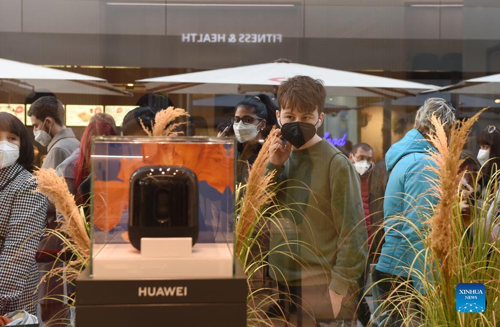 Customers shop at the newly opened Huawei flagship store in Vienna, Austria, Oct. 20, 2021. The Huawei flagship store officially opened Wednesday in the city center of Vienna. (Xinhua/Guo Chen)