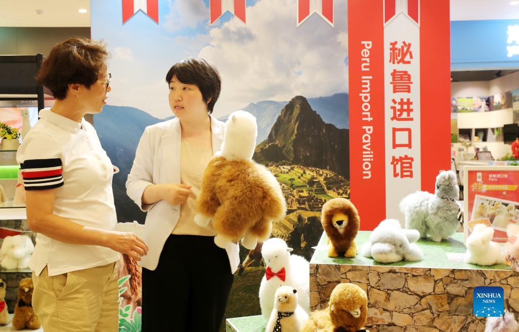 Ma Yuxia receives a visitor at the Peru Import Pavillon of the Greenland Global Commodity Trading Hub in Shanghai, east China, Oct. 15, 2021. At the first China International Import Expo (CIIE), Ma Yuxia, a Chinese businesswoman based in South America, introduced the plush toy alpacas made by Uncle Mamani, a Peruvian craftsman, into the Chinese market. Ma and her Peruvian partners rented a booth of merely 9 square meters at the first CIIE to display and promote these toys and other traditional hand-made artcrafts in Peru. They also established their own brand, known as Warmpaca (meaning "warm alpaca"). The business was unexpectedly successful. After participating in the CIIE for three consecutive years, Ma and her partners gained access to the Chinese market with these cute little "alpacas". At the 4th CIIE, Ma's booth is to expand fourfold. On the other side of the Pacific, Uncle Mamani's family has built a new house, bought a car, and involved nearly 200 people from his village in his business. (Xinhua/Fang Zhe)