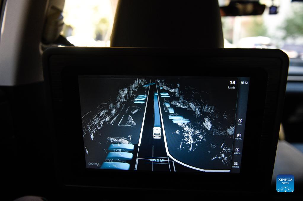 Traffic condition and route information are displayed on a screen inside an autonomous vehicle during a driverless test on a road in Yizhuang of Beijing, capital of China, Oct. 19, 2021. A total of 278 roads stretching more than 1,027 km in Beijing have been opened for self-driving vehicle tests as of September end, according to Beijing Innovation Center for Mobility Intelligent (BICMI). (Xinhua/Peng Ziyang)