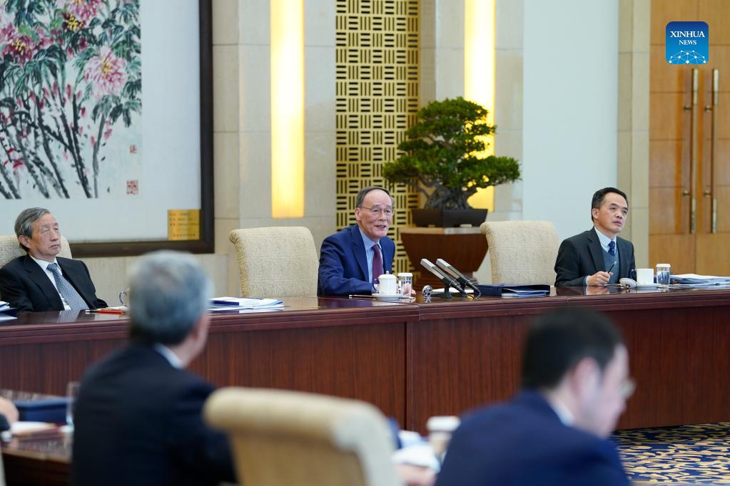Chinese Vice President Wang Qishan meets with members of the advisory board of the elite Tsinghua University School of Economics and Management via video link in Beijing, capital of China, Oct. 20, 2021. (Xinhua/Zhang Ling)