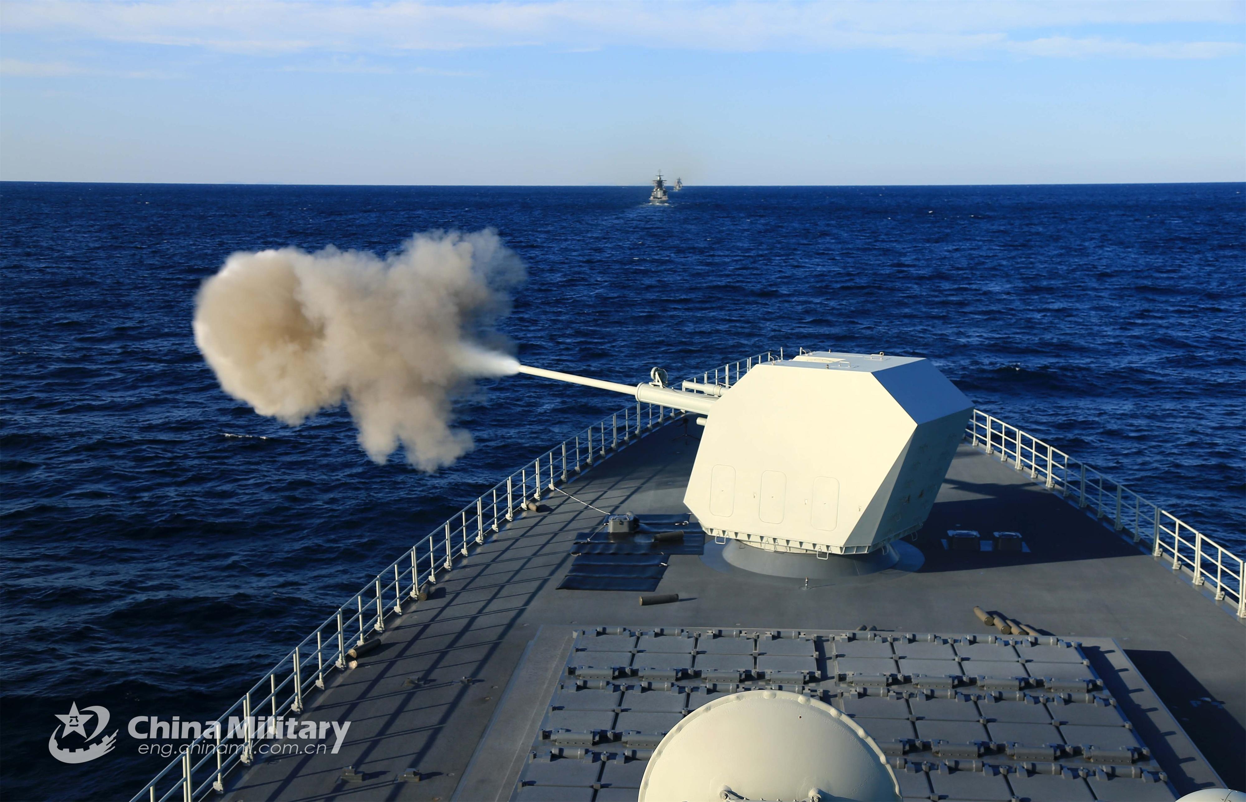 The Chinese naval destroyer Nanchang (Hull 101) fires its main gun at simulated target during the China-Russia joint naval exercise Joint Sea-2021 on Oct. 15, 2021. Being a normal arrangement made by the two navies according to the annual plan, the Joint Sea-2021 exercise kicked off on October 14 in waters near Russia's Peter the Great Bay. (eng.chinamil.com.cn/Photo by Li Tang)