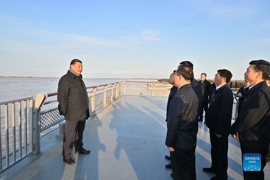 Chinese President Xi Jinping, also general secretary of the Communist Party of China Central Committee and chairman of the Central Military Commission, checks the Yellow River's waterways and learns about the ecological protection and high-quality development of the Yellow River basin at a dock as he inspects the estuary of the Yellow River in the city of Dongying, east China's Shandong Province, Oct. 20, 2021. (Xinhua/Li Xueren)