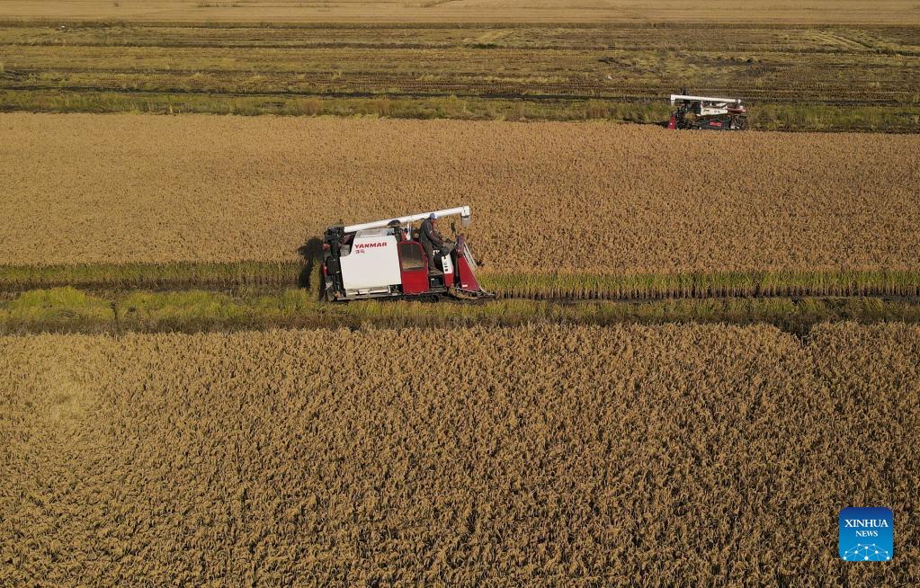 Aerial photo taken on Oct. 21, 2021 shows farmers operating harvesters on a rice field in Wangtan Town of Tangshan, north China's Hebei Province. (Xinhua/Zhu Xudong)
