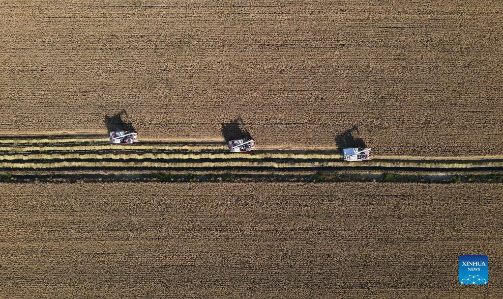 Aerial photo taken on Oct. 21, 2021 shows farmers operating harvesters on a rice field in Wangtan Town of Tangshan, north China's Hebei Province. (Xinhua/Zhu Xudong)