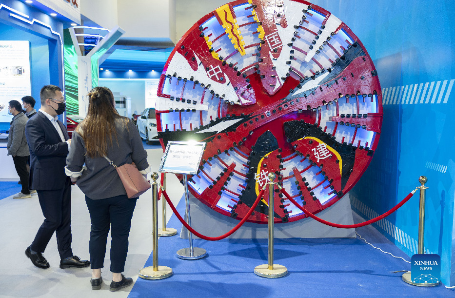 Visitors view the model of a domestic tunnel boring machine at an exhibition on China's major scientific accomplishments during the 13th Five-Year Plan period (2016-2020) in Beijing, capital of China, Oct. 21, 2021. An exhibition showing China's achievements in scientific and technological innovation during the 13th Five-Year Plan period kicked off here on Thursday. (Xinhua/Cai Yang)