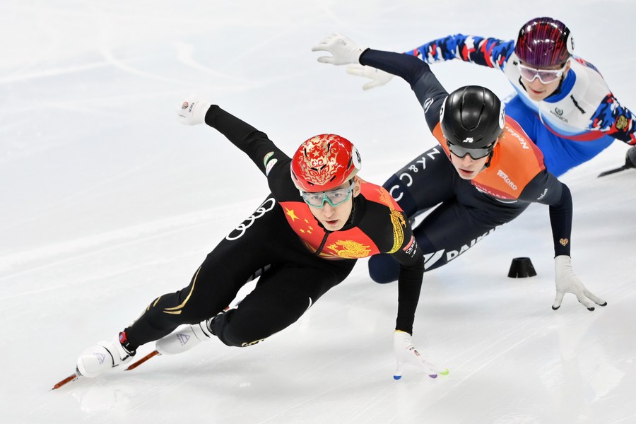 Wu Dajing (front) of China competes in the men's 500m preliminaries at ISU World Cup Short Track 2021/2022 in Beijing, capital of China, on Oct. 21, 2021. (Xinhua/Ju Huanzong)