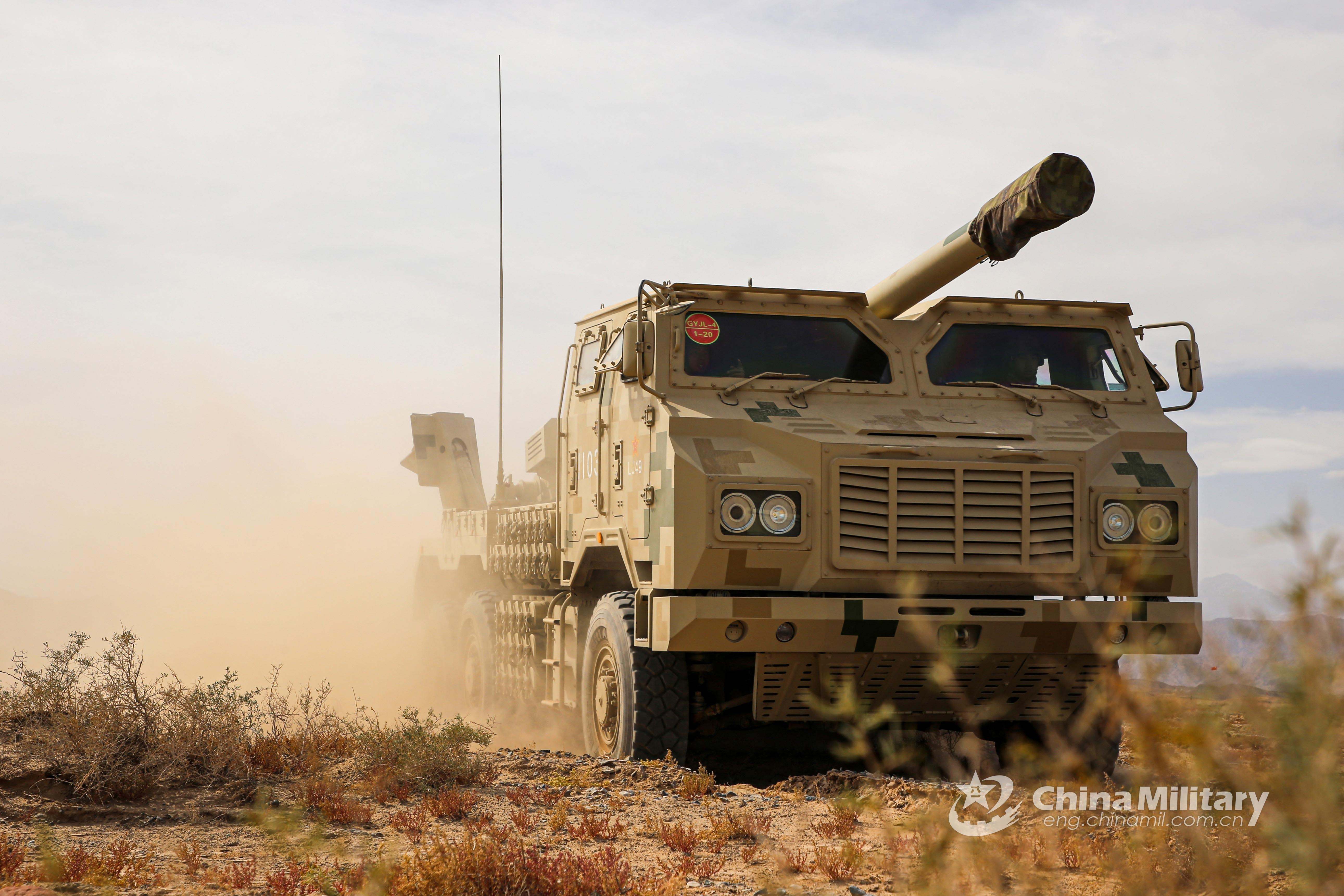 A vehicle-mounted howitzer attached to an artillery element under the PLA Xinjiang Military Command rumbles through the desert to the designated area for tactical training on October 11, 2021. (eng.chinamil.com.cn/Photo by Chen Ming)