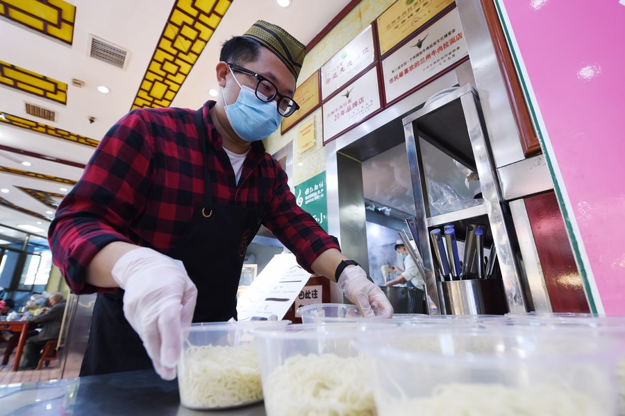 A restaurant staff member packs up take-away beef noodles for COVID-19 prevention and control volunteers at a beef noodle restaurant in Lanzhou, northwest China's Gansu Province, Oct. 22, 2021. (Xinhua/Fan Peishen)
