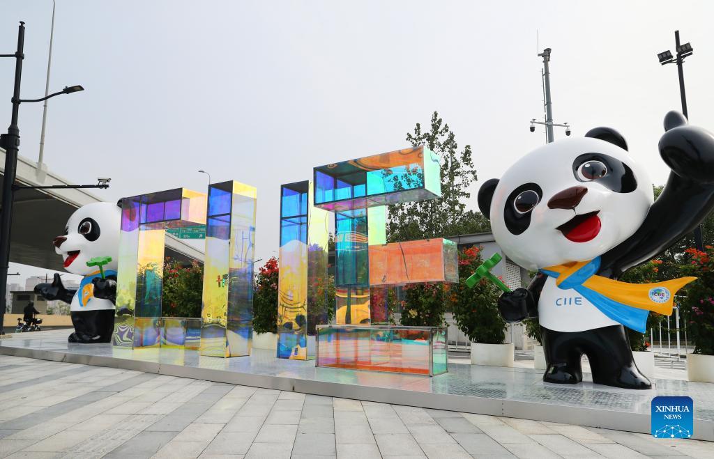 Photo taken on Oct. 22, 2021 shows decorative installations near the National Exhibition and Convention Center (Shanghai), a main venue for the fourth China International Import Expo (CIIE), in east China's Shanghai. The expo is set to take place in Shanghai from Nov. 5 to 10 this year. (Xinhua/Fang Zhe)