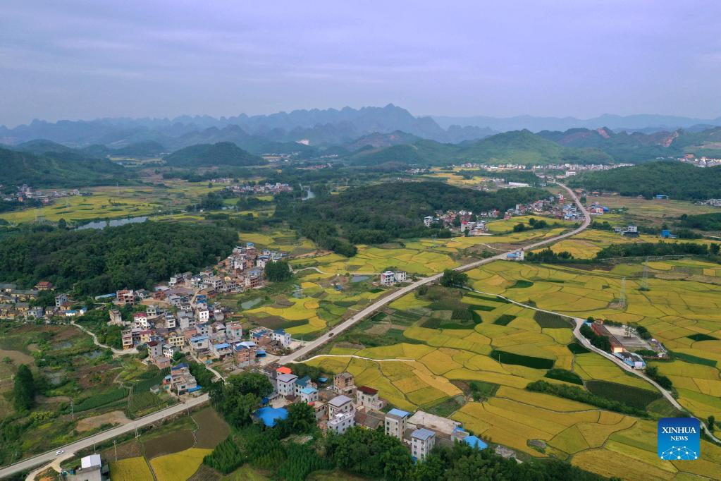 Aerial photo taken on Oct. 23, 2021 shows the countryside scenery at Xingui Village of Rongan County, south China's Guangxi Zhuang Autonomous Region. (Xinhua/Huang Xiaobang)