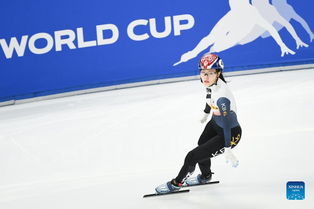 Lee Yubin of South Korea reacts after the women's 1500m final at ISU World Cup Short Track 2021/2022 in Beijing, capital of China, on Oct. 23, 2021. (Xinhua/Ju Huanzong)