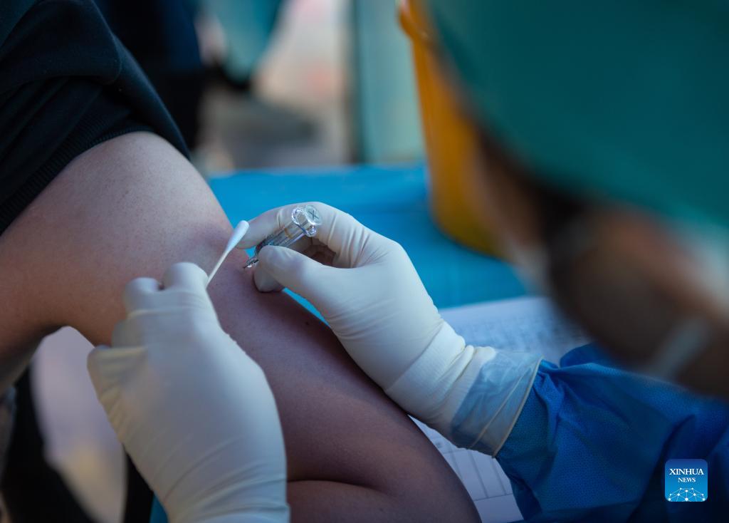 A medical worker administers a booster shot of the COVID-19 vaccine to a resident at a temporary vaccination site in Changping District of Beijing, capital of China, Oct. 23, 2021. (Xinhua/Chen Zhonghao)