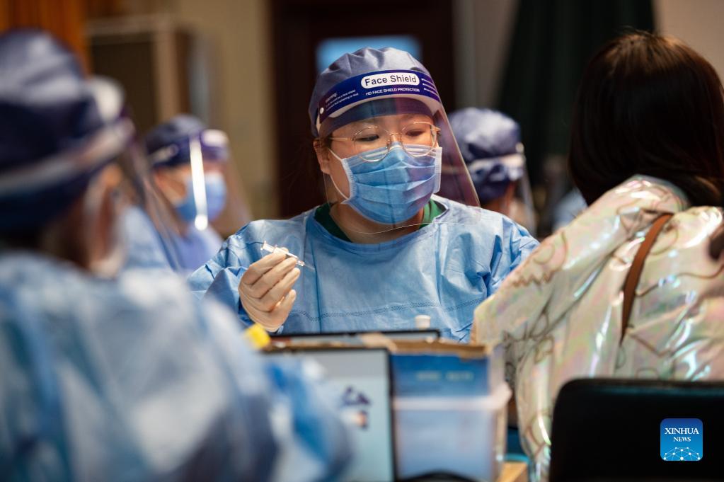 A medical worker prepares to administer a booster shot of the COVID-19 vaccine at a temporary vaccination site in Changping District of Beijing, capital of China, Oct. 23, 2021. (Xinhua/Chen Zhonghao)