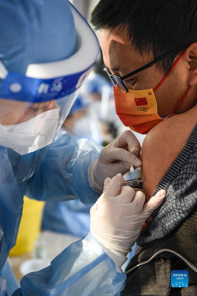 A medical worker administers a booster shot of the COVID-19 vaccine to a resident at a vaccination site in Daxing District of Beijing, capital of China, Oct. 23, 2021. Yizhuang of Daxing District began to offer a booster shot of the COVID-19 vaccine from Thursday. (Xinhua/Peng Ziyang)