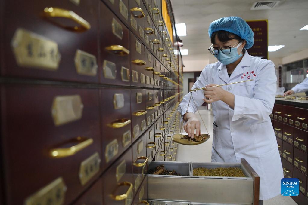 A pharmacist fulfills a Chinese Traditional Medicine (TCM) prescription at Gansu Provincial Hospital of Traditional Chinese Medicine (TCM) in Lanzhou, northwest China's Gansu Province, Oct. 23, 2021. Pharmacists of the hospital are busy providing decoctions for COVID-19 prevention and control to individuals under medical quarantine and medical workers at the frontline. The hospital also offered the decoctions to local residents for free at the outpatient hall. (Xinhua/Chen Bin)