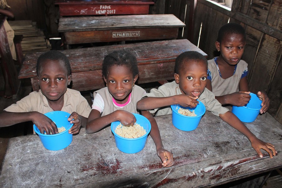 Students have China-aided rice for lunch at Toyoyome primary school at suburb of Cotonou, Benin, Oct. 17, 2019. (Photo by Seraphin Zounyekpe/Xinhua)