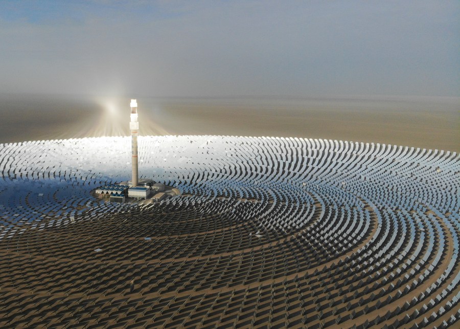 Aerial photo taken on Feb. 24, 2021 shows a molten-salt solar thermal power plant in Dunhuang, northwest China's Gansu Province. (Xinhua/Ma Xiping)