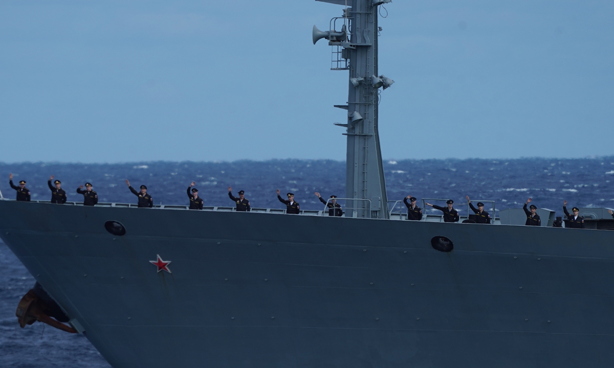 Russian soldiers wave at a ceremony on October 23, the last day of the first China-Russia joint sea patrol which started on October 17. (Photo: Xinhua)